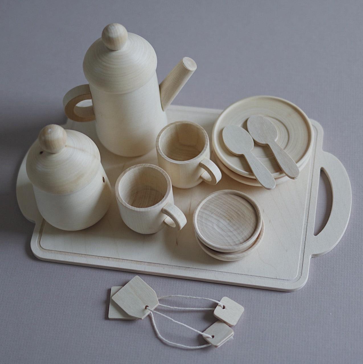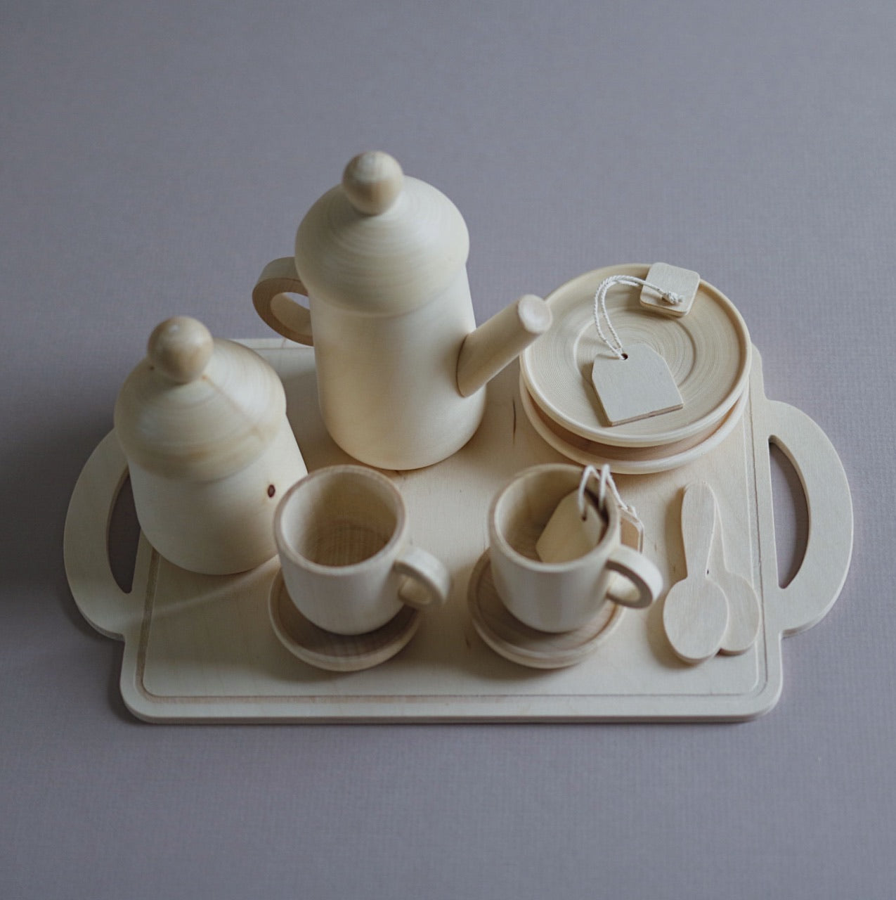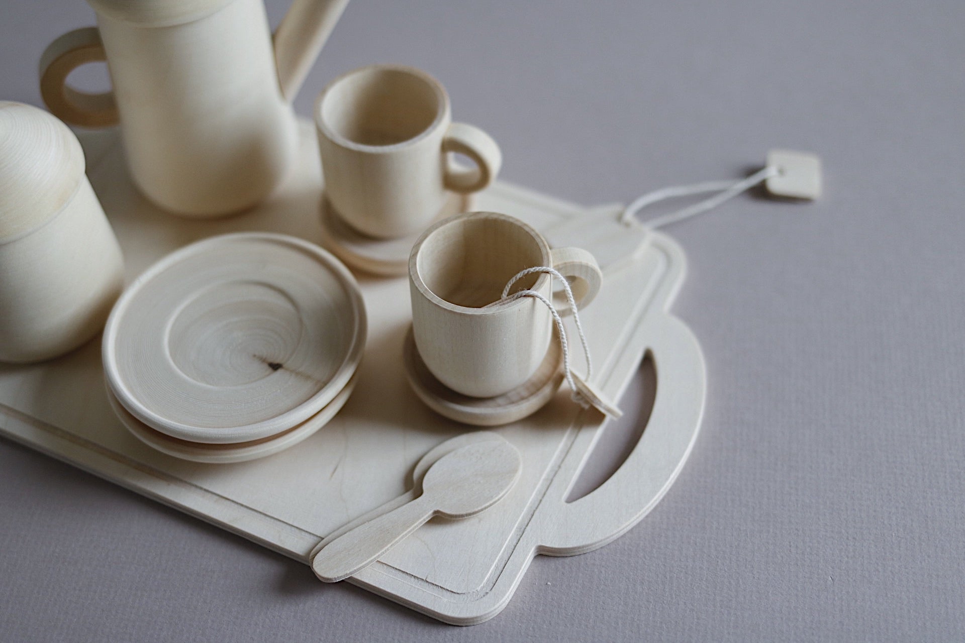 MATERIALS: Sustainably sourced linden wood and birch plywood. Tea set is unvarnished and unpainted.