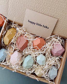 MATERIAL: Our stones are made of maple wood. All our wood is sourced responsibly from FSC certified suppliers. Painted with non toxic, toy safe certified paint and varnished with organic linseed oil. Packed in a kraft box, which is designed to be reused or easily recycled.