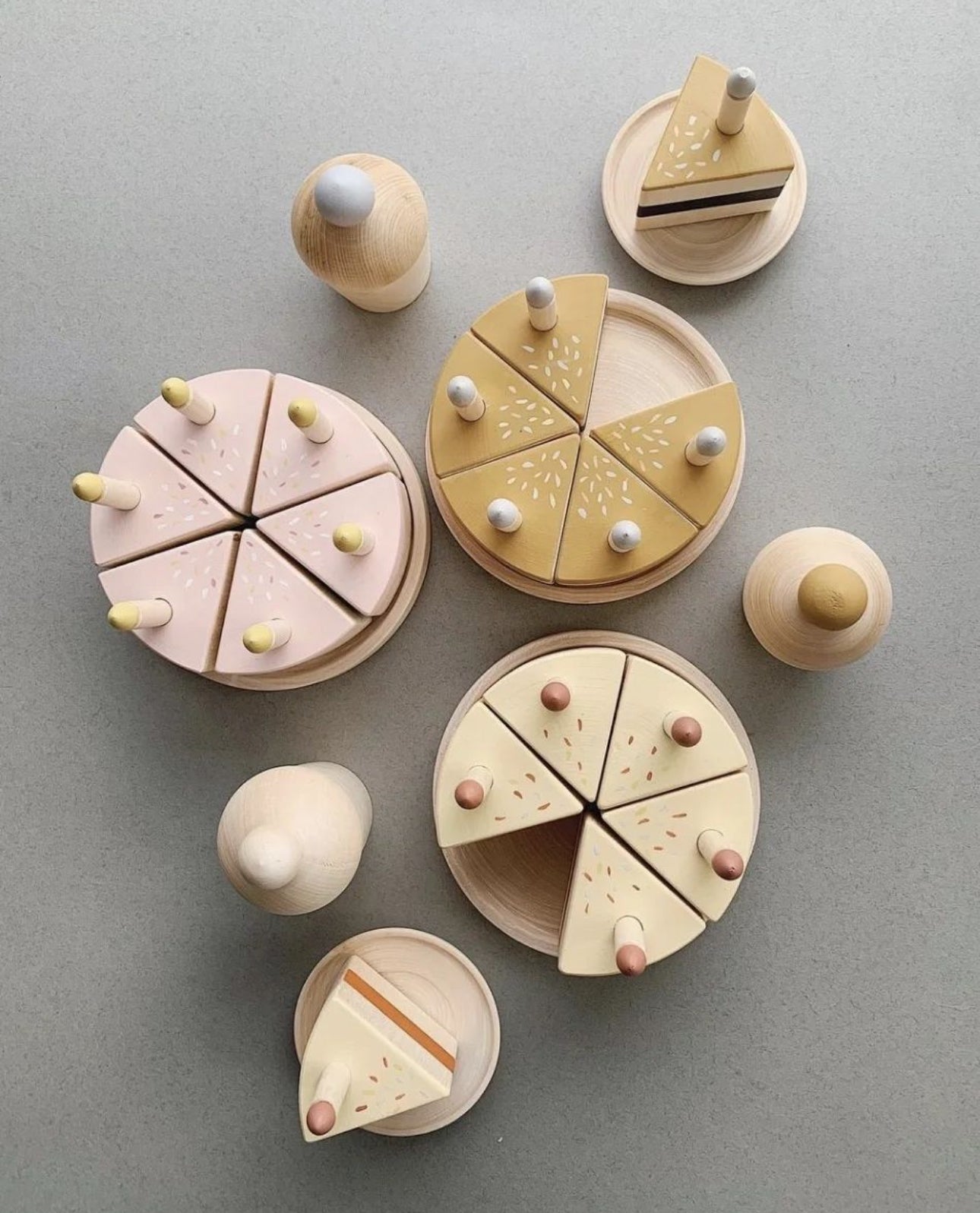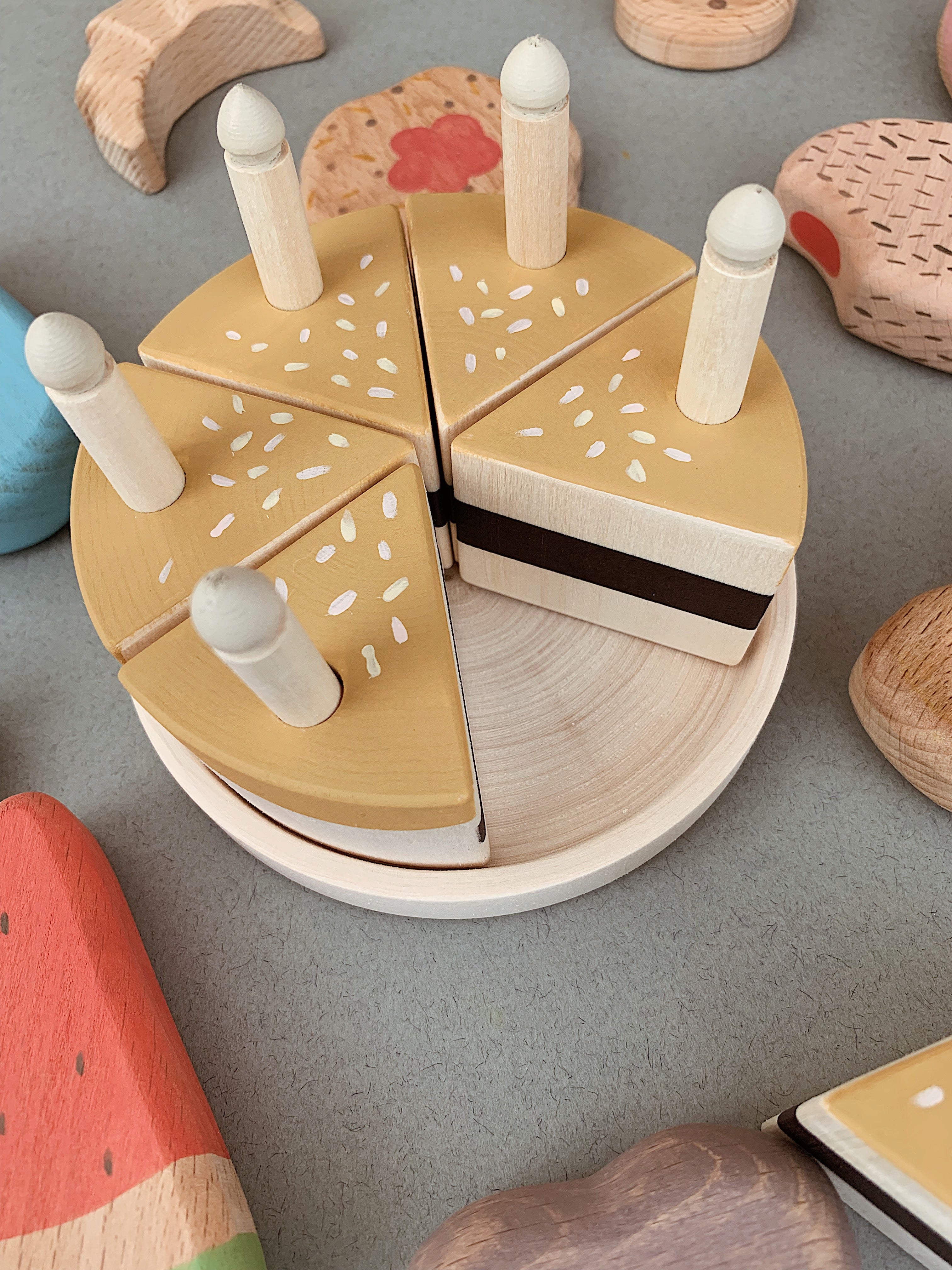Each cake is handcrafted from beautiful linden wood and hand painted with non toxic, toy safe paint and sealer.