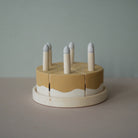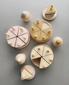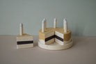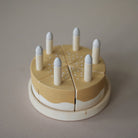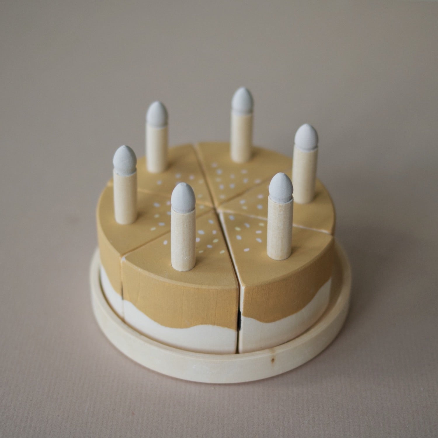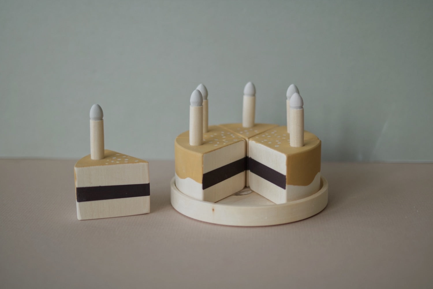 Salted caramel cake with chocolate filling and sprinkles, perfect addition to your child's play kitchen. Each cake consists of 6 slices with a cream filling, 6 removable candles and a plate to serve it all on.